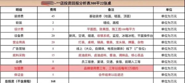 结果,加盟商成了被割的“第二茬韭菜”。明星加盟根本不是为了帮助加盟商赚钱,而是把他们当成了待宰的羔羊。一份明星火锅店的单店投资回报分析表揭露了其中的秘密:光是加盟费就要交48万,这还只是品牌授权费,有效期只有三年。