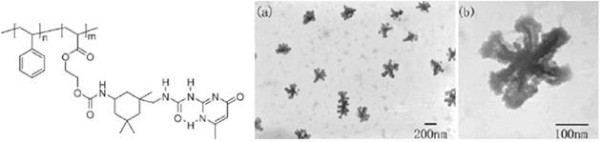通过分子间非共价作用(包括范德华力、静电引力、氢键力、π-π相互作用力与疏水相互作用等)形成的超分子聚合物,具有不同于传统聚合物的全新性能。采用活性自由基聚合,制备了侧基具有四重氢键单元的嵌段共聚物,并以四重氢键驱动其溶液自组装,获得了独特的雪花状组装结构(Macromolecular Rapid Communication, 2008, 29, 258-263)。