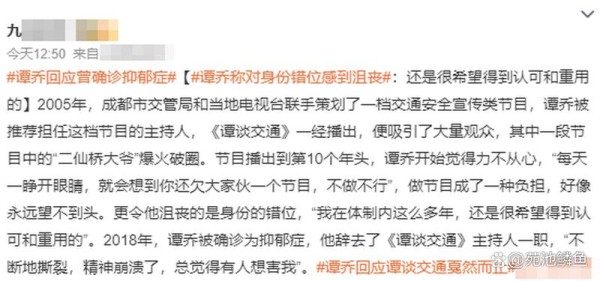 如今,谭sir透露了不少《谭谈交通》停播的信息,当然也确认了自己抑郁症的情况。