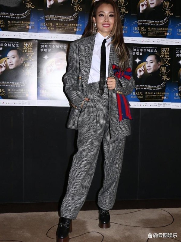 身为罗文的徒弟,容祖儿当然不能缺席。只见她穿着一身灰色格纹西装,配上时髦的长发,打扮帅气十足。