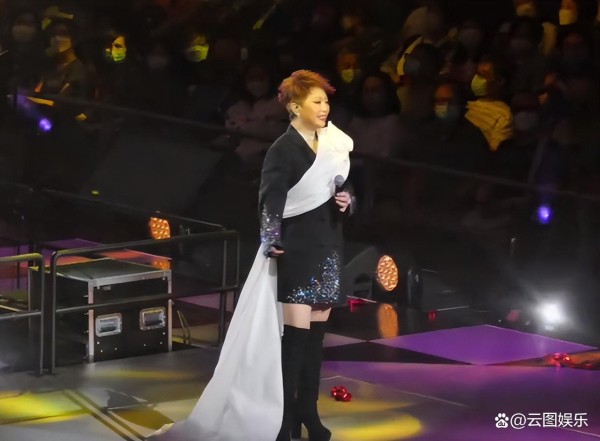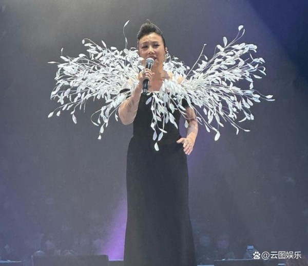 汪明荃独自一人上台献唱,她穿了一袭黑色连衣裙,裙子设计非常特别,肩膀位置弄了很多白色长羽毛,让她气场变得很强大。