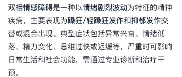 双相情感障碍,这一精神疾病名词,近日引起了广泛关注。程潇,一位公众人物,也在综艺节目中自白自己曾罹患双相情感障碍,她的经历引发了广泛关注。这一事件提醒我们,明星的情绪问题同样值得关注与探讨。