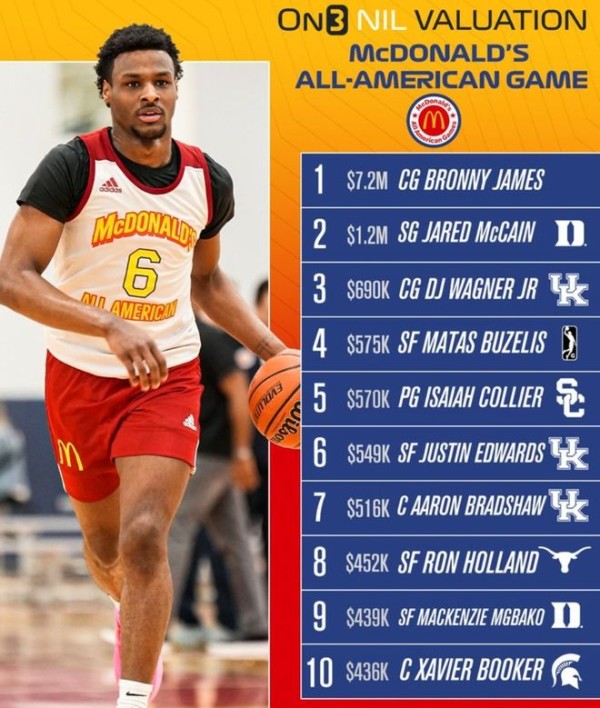 已经承诺加盟杜克大学的潜力新星贾里德·麦凯恩的估值是120万美元,排在第二,但被布朗尼远远甩在身后。