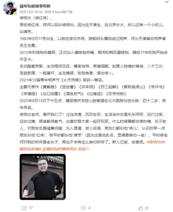 2025年9月13日傍晚,北大医院传来令人心碎的消息——年仅42岁的相声演员修明炎因糖尿病并发症引发心脏衰竭,不幸与世长辞。这一突如其来的噩耗迅速席卷网络,令无数观众与同行扼腕叹息。