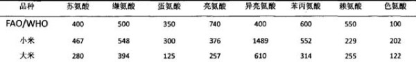 表中可以清楚的看出,小米蛋白质中和大米蛋白质中都含有人体所需的8种氨基酸,大米除了赖氨酸略高于小米,小米所含其他种类的必须氨基酸含量都比大米多。