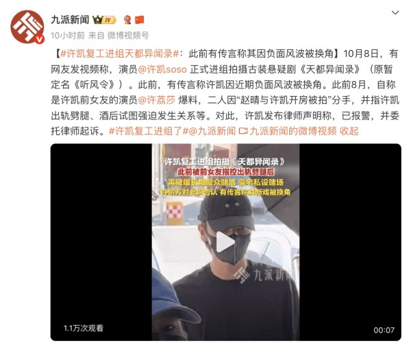 10月8日,有网友发布视频称,演员许凯已正式进入剧组,投入古装悬疑剧《天都异闻录》(原暂定名《听风令》)的拍摄工作。此举也被视为对早前“因负面风波被换角”传言的直接回应。