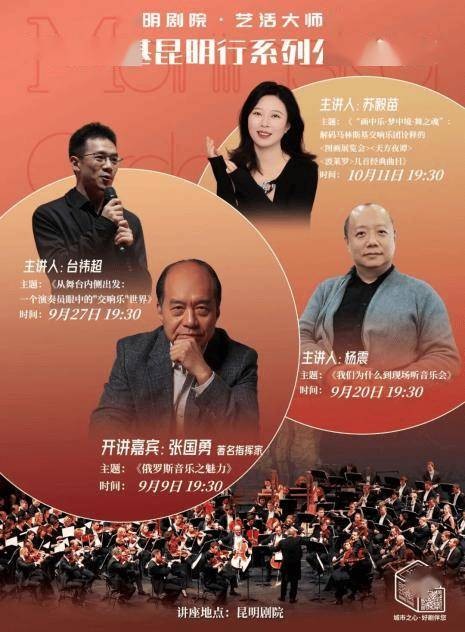 为让乐迷深入领略交响艺术,昆明剧院还策划了「马林斯基昆明行」系列公益讲座,特邀四位国内知名音乐学者,于9月至10月间推出四场全免费的专题讲解,从多角度解析乐团历史与交响乐鉴赏,为市民提前科普交响乐知识。为扩大受众覆盖面,剧院联合云南省文化和旅游厅、云南日报、昆明文旅,通过四个线上账号同步直播,并邀请媒体进行现场报道,使更多市民共享艺术资源。目前讲座反响热烈,从中国指挥界旗帜人物张国勇教授大咖开讲,到著名录音师、音乐制作人杨震老师,再到本土乐团优秀演奏家台祎超老师,前三期线上线下累计观看已突破28万人次,第四期在10月11日与大家见面,云南艺术学院苏毅苗教授将为广大观众详解本此音乐会曲目单。昆明剧院将与团方协商更多此次“马林斯基昆明行”限定惊喜,请各位观众持续期待。