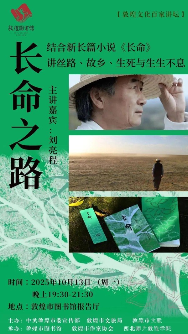 风声与钟声,在此交织千年。今晚7:30,敦煌市图书馆报告厅,在丝路的起点,听刘亮程讲述《长命》中那条“由钟声铺成的路”,走进一个关于故乡、生死与生生不息的永恒故事。