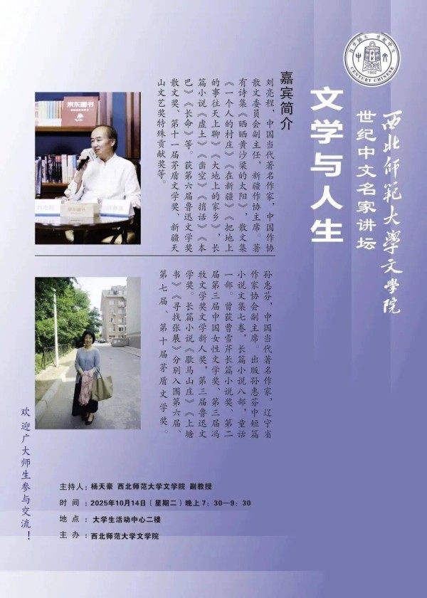10月14日(星期二)晚上7:30,刘亮程将做客西北师范大学文学院,与作家孙惠芬一起走进文字与生命交汇的深处。本场活动由文学院副教授、博士生导师杨天豪主持。
