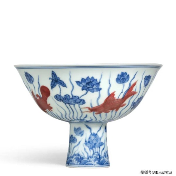 此件极为珍罕的高足盌乃景德镇御窑工艺与美学造诣之双重典范。四尾红鱼悠然游弋于青花莲池之间,红蓝二彩相映生辉,完美体现道家「鱼乐」之哲学意境。此一纹饰渊源可追溯至战国庄惠濠梁之辩,历经宋元文人画洗礼,终成瓷绘经典。然明初之前,鱼藻纹仅能以单一青花呈现;直至景德镇御窑匠人创烧出铜红釉与钴蓝釉交辉之绝技,方使此传统纹样达到前所未有的艺术高度。