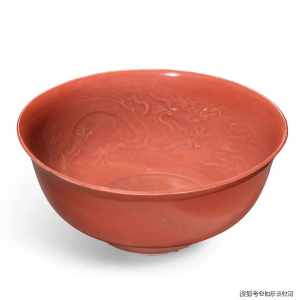 此红釉印云龙纹大盌属极罕品类,乃有明一代最早专为仪礼烧造的御用红釉器之典范。铜红釉素为中国陶瓷史中最具技术挑战之品种。元代虽已试烧,然呈色极难掌控。洪武朝之铜红釉器釉色柔润且略呈斑驳粉韵,独具本朝特色,盖因窑内还原气氛多变,加之铜料于高温下反应无常所致。其红有别于永宣时期所臻明艳朱红,亦与元代多见之深沉褐红迥异。
