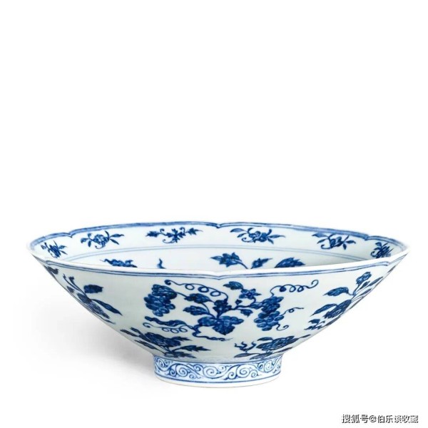 本品以明快钴蓝彩自由绘就繁花硕果纹样,实乃备受推崇的宫廷御制瓷器典范。其大胆的斗笠形盌壁隐约可见花叶轮廓,此造型承袭自宋瓷传统器型。