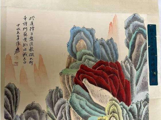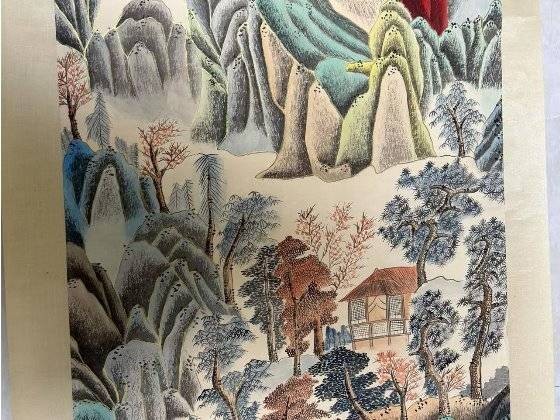 1. 色彩运用:以“重彩青绿”为底,绛红、石青、石绿等矿物颜料层层叠加,却通过淡墨晕染调和,既保留传统青绿的富丽华贵,又避免了艳俗感,呈现“浓而清、艳而雅”的视觉效果。