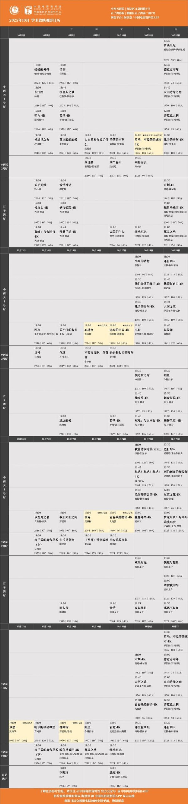 所有场次均可在淘票票、中国电影资料馆APP购票,具体排片见末图,祝大家观影愉快。❤️