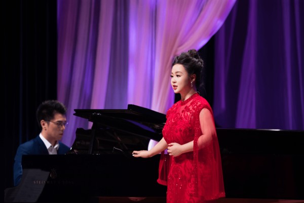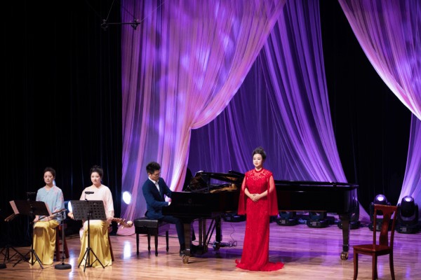 音乐会在曲目编排上独具匠心,以中国文学史为脉络,精选十五首经典诗词作品。从《诗经》开篇之作《关雎》的婉转含蓄,到唐宋诗词《枫桥夜泊》的深远意境、《锦瑟》的朦胧隽永,再到《青玉案·元夕》的缠绵悱恻......在林沛莎圆润明亮、富有艺术感染力的美声演绎下,整场演出宛如一幅流动的诗词长卷。演出巧妙融合了钢琴、琵琶与箫等东西方乐器,琵琶的珠玉之声与箫的空灵悠远同美声唱法交织对话,成功让古典诗词的可听、可感、可触成为现实,深深打动了在场每一位观众。