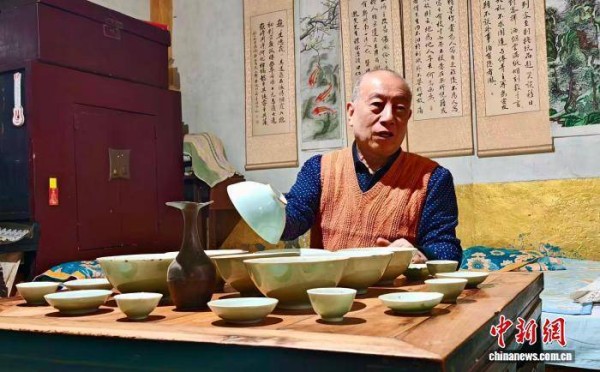 73岁的郑三宝正在介绍豆青瓷餐具。 王惠林 摄