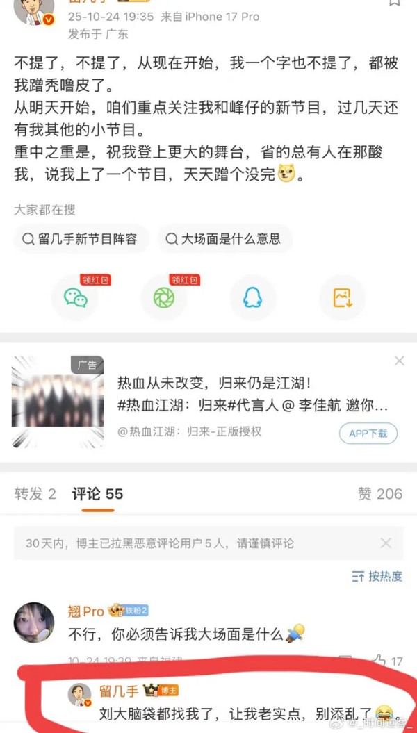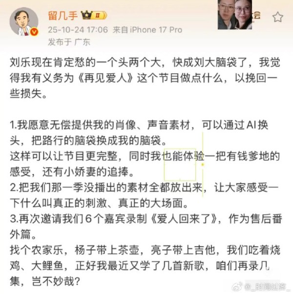 #留几手谈路行退出再见爱人5#再爱 5 制片人刘乐喊话留几手别添乱了!哈哈哈,《再见爱人》5因为嘉宾退出乱成一团,期待一年的《爱人回来了》已流产。这可把上一季嘉宾刘爽乐坏了。不仅全程看笑话,还给出建议,比如换成他的脸,比如邀请他与杨子回去救场再录一次,再比如把上一季未播出的炸裂场面播放出来。这一系列操作,可把刘乐气坏了,直接在评论区留言:别添乱了。