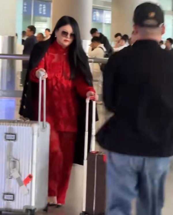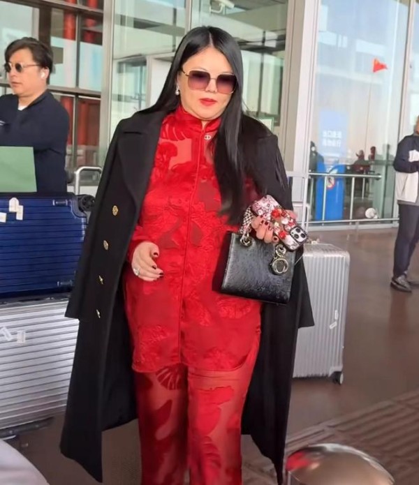 那时李湘一身红色服饰露面,外表还披了一件黑色长款大衣,戴着墨镜,手提包包。