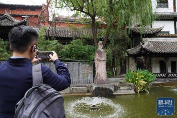↑ 10月27日,游客在重庆奉节白帝城景区拍摄刘禹锡雕像。新华社记者 周佳谊 摄