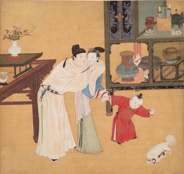 此时妻子还不忘抓住身着一袭华贵红衣调皮孩子的手,原来地上有两只小狗正在交媾,小孩子不解风情,正要出手驱赶,被母亲出手拉住。