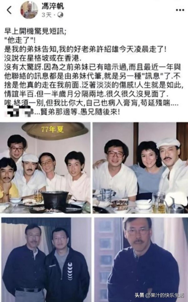 前几天,76岁的许绍雄因癌症离世,当时有很多香港明星去看望他,佘诗曼更是多次泪洒现场。之后也有很多好友发文悼念。其中,冯淬帆发文称“贤弟那边等,愚兄随后来”。