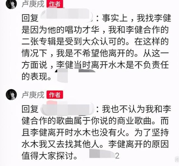卢庚戌还在社交账号上回怼网友称李健退出水木年华是不负责的表现,本来他是不希望李健离开,还称李健离开水木年华并没有火,水木年华当年大红也和李健没有关系。 卢庚戌发表完此番言论后遭到了很多网友的吐槽,很多网友认为如果不是靠李健的才华,水木年华能红吗?李健离开后,组合没多久也就糊了。