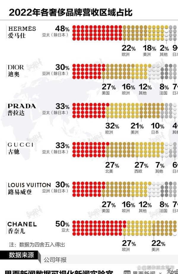 中国顶级奢侈品牌的代言策略正在发生一些变化。过去,能够代表顶级奢侈品牌的中国艺术家非常有限,而且大多都是实力派演员,比如周迅、李冰冰等人。但2016年前后,随着中国社交媒体的发展和流量明星的崛起,不少顶级奢侈品牌开始与流量明星合作,导致中国代言人/形象大使数量激增。与流量明星合作往往可以在短时间内快速提升品牌知名度。比如肖战与GUCCI合作后的两天内,就为品牌带来了96%以上的品牌热度。亚洲市场,尤其是中国市场,现已成为众多顶级奢侈品牌最重要的收入来源之一。到2022年,众多奢侈品牌在亚太市场的销售额占比将超过30%,爱马仕、香奈儿等品牌在该地区的销售额甚至将接近整体销售额的一半。