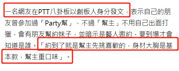 据悉,今日(4月24日),台媒突然放出一则爆料,一位知情人、台湾著名八卦论坛创办人发帖称,他的一个朋友就曾经参加过罗志祥的派对,在每次派对举办之前会有专人去约女生的,并且还会对外表示有艺人参加,但不会明确说明究竟是谁,只有到场了才能知道。