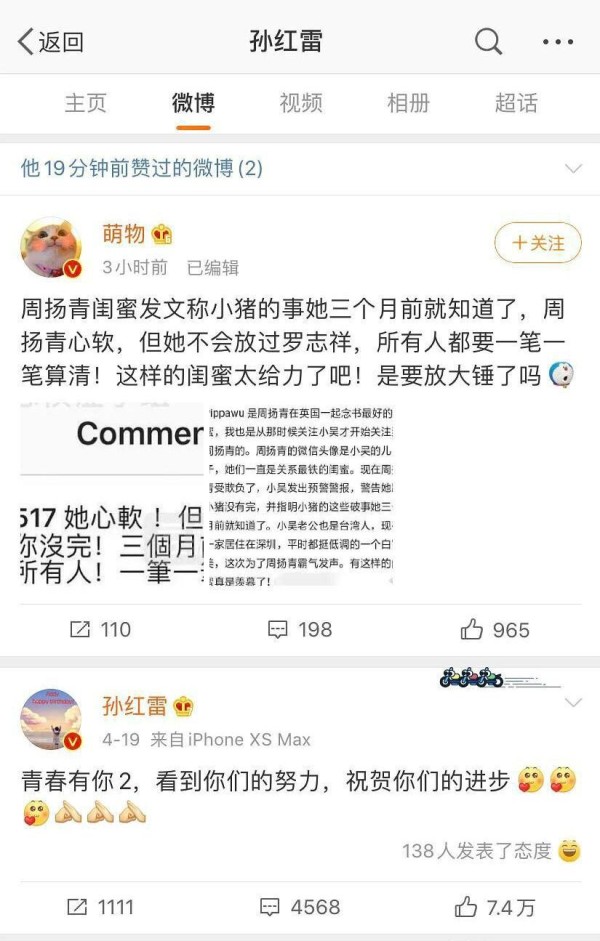 周扬青闺蜜放话不放过罗志祥,孙红雷点赞支持?手滑还是挺周扬青罗志祥与周扬青事件:手滑点赞已成为明星暗戳戳站队的方式