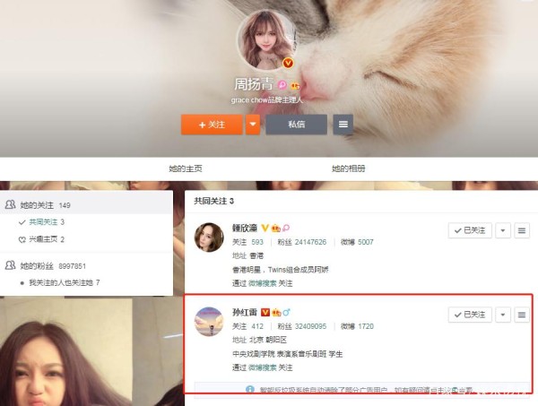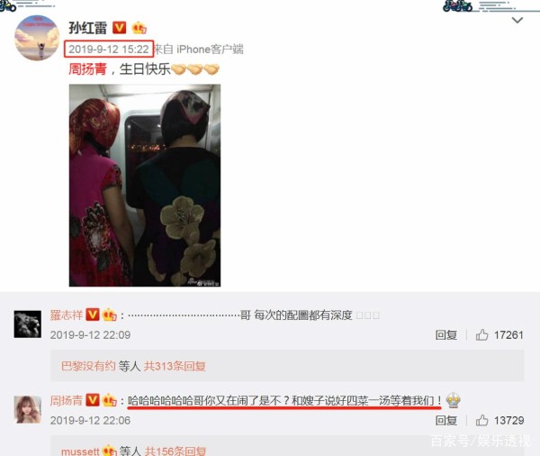 虽然说孙红雷是通过罗志祥才认识的周扬青,但是多年下来孙红丽与周扬青关系还不错,早在2016年时孙红雷便和周扬青互动,当然更多的是调侃她与罗志祥的恋爱。此外,孙红雷去年9月还曾为周扬青送生日祝福,当时还晒出一张与罗志祥的搞怪照,而在评论中周扬青也亲切的称呼孙红雷为哥,并称让他和嫂子准备好饭菜等着她和罗志祥,同时孙红雷也是周扬青关注的“男人帮”成员中的唯一一位。