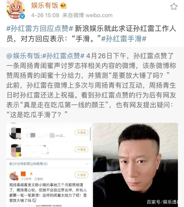 然而,随着周扬青爆料罗志祥的丑事,当年的情景已完全破坏,如今孙红雷又点赞了周扬青闺蜜找罗志祥算账的微博,对此不少网友热议孙红雷是否站在了周扬青这一边。对此,有媒体联系到孙红雷的工作人员进行求证,显然工作人员也知晓了此事毕竟该话题已上热搜,对此工作人员的回应则是“手滑”,其实想想也能理解,孙红雷作为公众人物,就算真的支持周扬青,也不可能这么公开的表达出来。