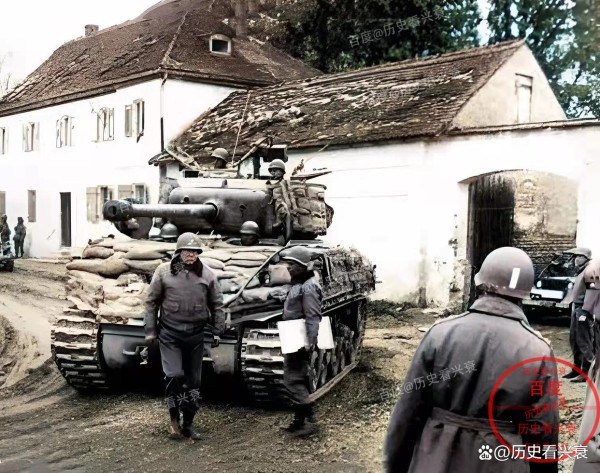 二战时期在欧洲战场拍摄的照片,走在坦克前面的男子是美国在第二次世界大战中的著名军事统帅巴顿将军。