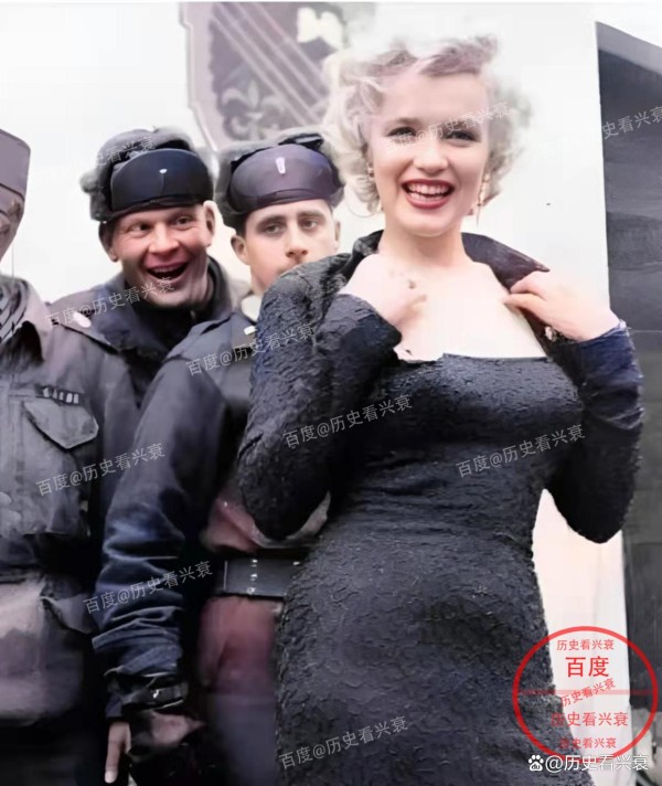 照片中可以看到梦露面对镜头显得非常开心,后面一名美军露出了惊讶的表情,可能他是梦露的忠实粉丝,能与自己的偶像如此近距离的接触,让他开心得都要惊掉了下巴似的。