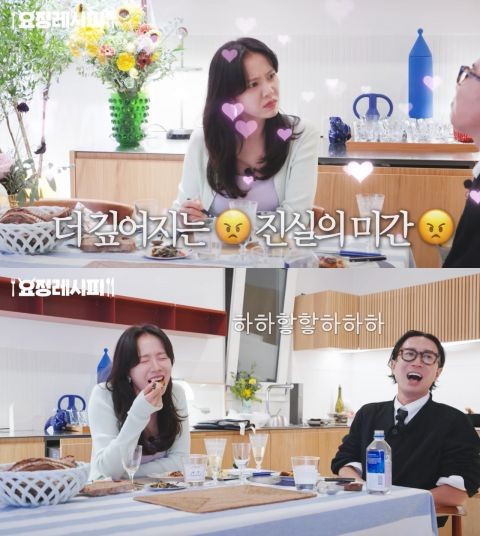 品嘗反烤蘋果塔時,孫藝真立即睜大雙眼:「一點都不甜,太美味了!」孫藝真以為沒放蘋果醬就不會讓人發胖,鄭在炯心虛說「真希望妳不會看到食譜」,孫藝真幽默回應:「回家一看,熱量居然有一千卡?」
