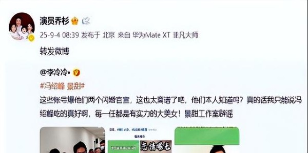 乔杉吃瓜“翻车”?转发冯绍峰和景甜闪婚爆料秒删,正主火速辟谣