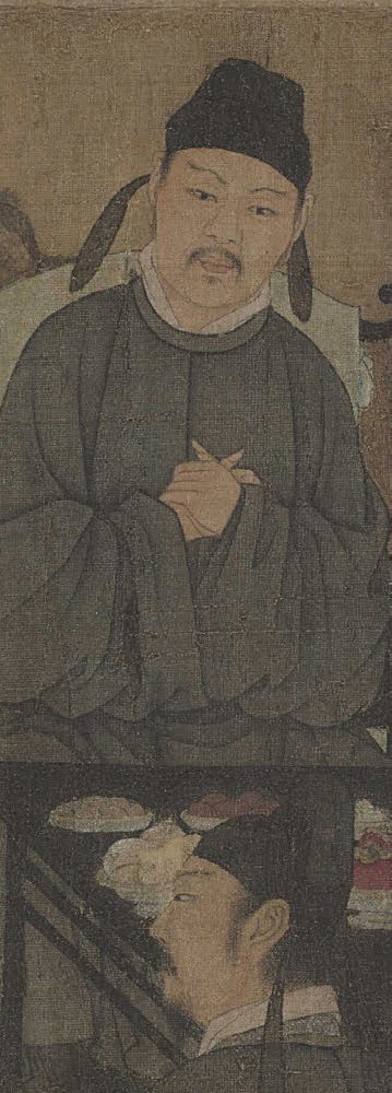 《韩熙载夜宴图》我从很早就开始研究,在《重屏》那本书里就写过它。但是我没有谈《偶遇》里说的东西,因为当时我还没有注意到这些细节——虽然看了很多很多次,但思考的是别的问题。后来我发现了画中的这四个人——其中三个是穿黑衣服的中年男性官员,一个是和尚——他们既不看跳舞也不听音乐,而是把手攥起来,把大拇指这么伸出来。这在宋代或者更早叫叉手礼,它表示一种恭敬。这几个人或是把眼睛垂下来或者往边上看。参加夜宴的几十个人中间忽然出现了这么四个人。画家为什画他们?我在书中提供了一个解答。