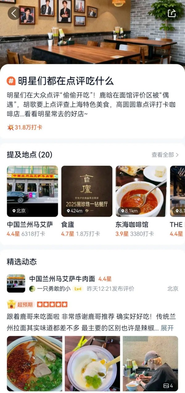 事实上,近年来不少明星都曾公开表示“找餐厅都靠大众点评”,多次掀起“粉丝打卡同款美食”热潮。此前,胡歌被问及上海特色时,就提到“还要查大众点评”;高圆圆也在个人社交账号中称“靠大众点评打卡上海咖啡店”。