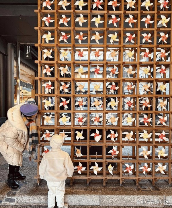 其中一张照片是在一个布满风车的木架前拍摄的,薛家燕和孙子背靠背地呈现在画面中。她的小孙子好奇地凝视着眼前的木架,而薛家燕则似乎在为孙子解说其中的奥秘。这张照片虽然是抓拍而成,却充满了自然和谐之美。除了薛家燕与孙子的合影外,这次旅行还罕见地留下了一家人的大合影。这一点之所以显得罕见,是因为通常能看到的是薛家燕与儿子一家的合照,而她的两个女儿却很少露面。