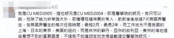 可你猜怎么着?就在大家都替她高兴的时候,网上突然冒出来一个自称是陈医生师弟的人,发了条帖子。这哥们儿在帖子里把师兄夸上了天,说他毕业于名牌大学,拿了一堆文凭,每年都参加救援任务,在公立医院上班的时候连假都不休,把年假全用去执行任务了。后来自己开诊所了,出国救援期间没收入还得交房租,照样义无反顾地去。
