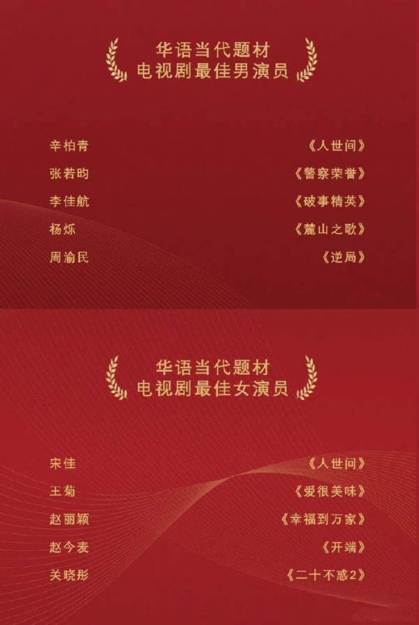 华语百强电视剧最佳男主角,其实就是“视帝”;华语百强电视剧最佳女主角,其实就是“视后”,因为是综合性的,不分题材,相对含金量高一些。雷佳音凭借《人世间》获得了金鹰视帝,殷桃凭借《人世间》获得了金鹰视后,所以他们有可能再次双双获奖。
