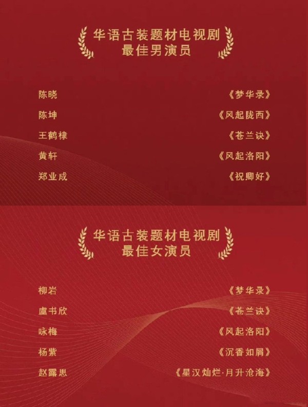 最精彩的角逐,还是“古装题材”,因为出演这一类电视剧的演员,大部分都是流量明星。陈晓、陈坤、王鹤棣、黄轩、郑业成入围“最佳男演员”;柳岩、虞书欣、咏梅、杨紫、赵露思入围“最佳女演员”。