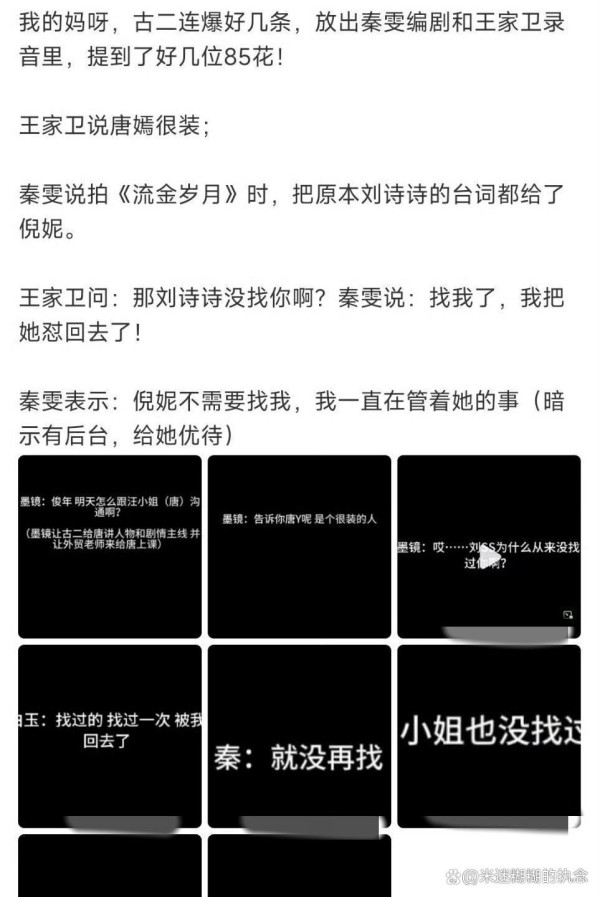 最近王家卫被曝私下没那么高冷,跟普通人没啥两样,还曾夸过唐嫣,真是让人意外。《流金岁月》编剧秦雯和倪妮关系不一般,刘诗诗也被卷进去了,圈内人情复杂得像电视剧。更炸裂的是,有人曝光录音,编剧自己承认喜欢“恶俗”剧情,还说写得挺好,难怪现在剧集槽点一堆,观众越吐槽,他们越淡定。娱乐圈的瓜,永远比剧本还精彩。