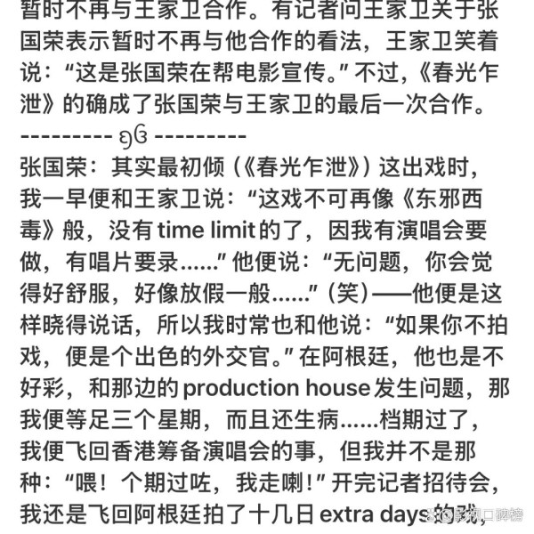 这不禁让人回想起这些年来,王家卫与多位顶级演员的合作均已中断。最出名的是张国荣,在拍摄后《春光乍泄》后宣布不再合作,在自己的97年演唱会上坦言身心俱疲;同样,张曼玉因《2046》戏份被删,一样觉得过于消耗演员;张学友因一个抬头动作重拍60次,心里留下阴影;梁家辉不仅替张国荣发过声,说《春光乍泄》是利用他的热度,更直言享受不了《东邪西毒》。