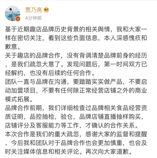 7月26日,贾乃亮在微博回应称,看到负面信息后深感愧疚和歉意。“基于近期趣店品牌历史背景的相关舆情,我和大家一样在密切关注,看到这些负面信息,本人深感愧疚和歉意。”同时表示,发现问题后已第一时间解约,双方也没有后续的任何合作。