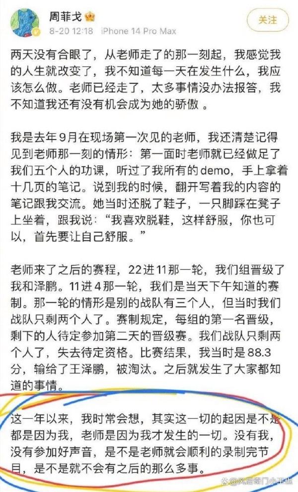 近日,参加选秀节目《星光大道》的学员周菲戈因导师李玟的离世而陷入巨大的痛苦之中。在8月20日这样一个令人痛心的日子里,李玟最看重的两位学员,周菲戈和王泽鹏,分别发声回应导师的离世。然而,周菲戈的回应让人揪心,他的精神状态似乎非常差,充满了自责和痛苦。