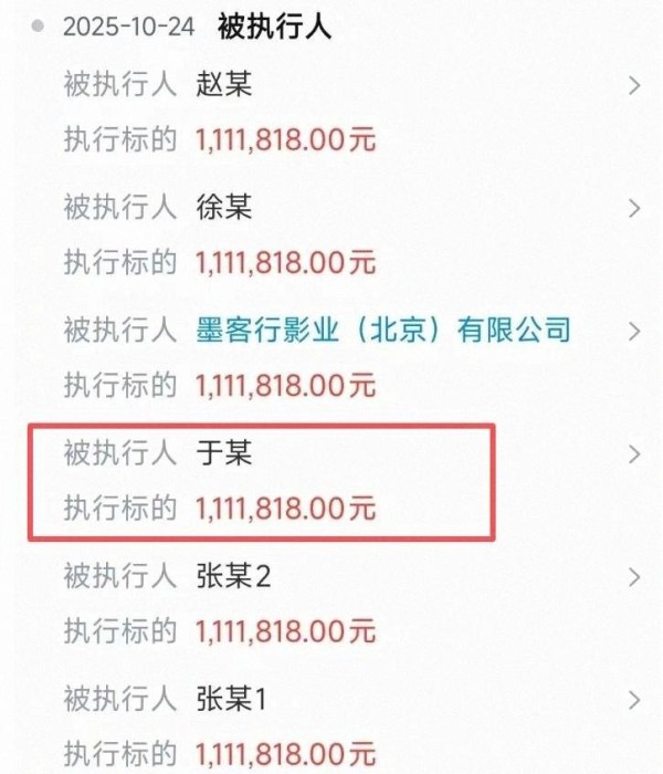 广东增城法院在10月27日对墨客行影业新增恢复执行111万余元,于谦因持股10%被牵连,截至10月28日他仍未公开回应