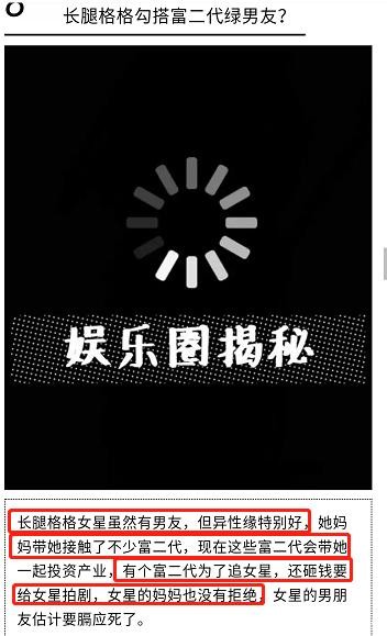 在2月19号,有知名娱记就在公众号爆料道:长腿格格勾搭富二代绿男友?在文中是这样说道:长腿格格虽然有男友,但异性缘特别好,她妈妈带她接触了不少富二代,现在这些富二代会带她一起投资产业;有个富二代为了追女星,还砸钱要给女星拍剧,女心的妈妈也没有拒绝,女星的男朋友估计要膈应死了!