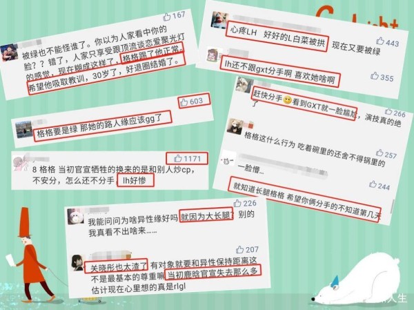 对于娱记口中的“长腿格格”,很多网友看了该爆料后也纷纷留言道:心疼LH,好好白菜被拱还要被绿、lh还不跟gxt分手啊,喜欢她啥、赶快分手,喜欢gxt啥、当初官宣换来和别人炒cp,lh好惨、关晓彤实在是太渣了……看来这些网友似乎猜到了娱记口中的当事人,对于关晓彤,媒体网友此前也确实以“长腿格格”来形容她!