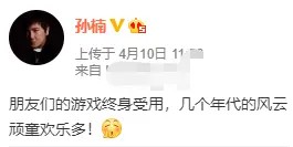 歌手孙楠在社交平台上更新了一张照片,并且配文“朋友们的游戏终身受用,几个年代的风云顽童欢乐多。”