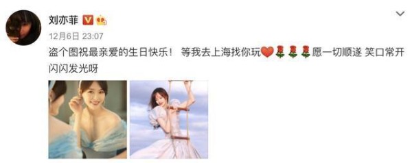 12月6日是,唐嫣的37岁生日,刘亦菲在社交媒体上发文为唐嫣庆生。虽然唐嫣在娱乐圈里她也算是一个85后小花旦,但是发文为其庆生的可以说是寥寥无几。这就显得刘亦菲和唐嫣的关系非同一般了,她在这一天的小尾巴上晒出了唐嫣的近照,并附文:盗个图祝最亲爱的生日快乐!等我去上海找你玩,愿一切顺遂,笑口常开,闪闪发光呀!